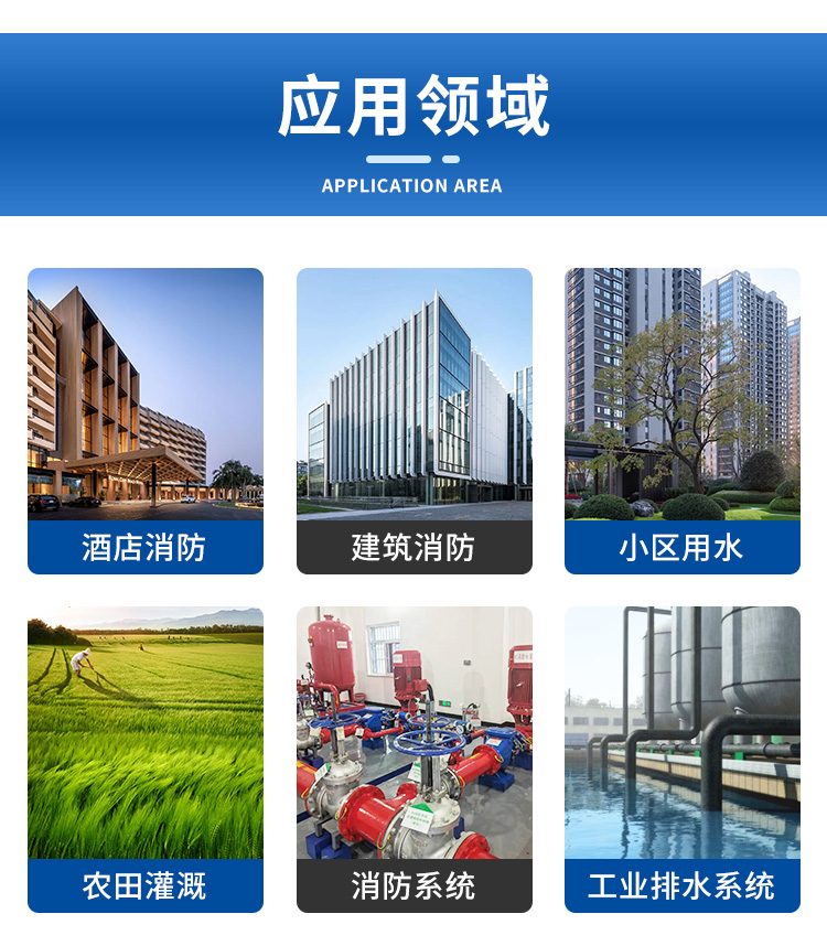用途廣泛:主要用于消防系統(tǒng)管道增壓送水,也適用于工業(yè)和城市給排水、高層建筑增壓送水、遠(yuǎn)距離送水、采暖、空調(diào)制冷系統(tǒng)送水及設(shè)備配套等領(lǐng)域。
