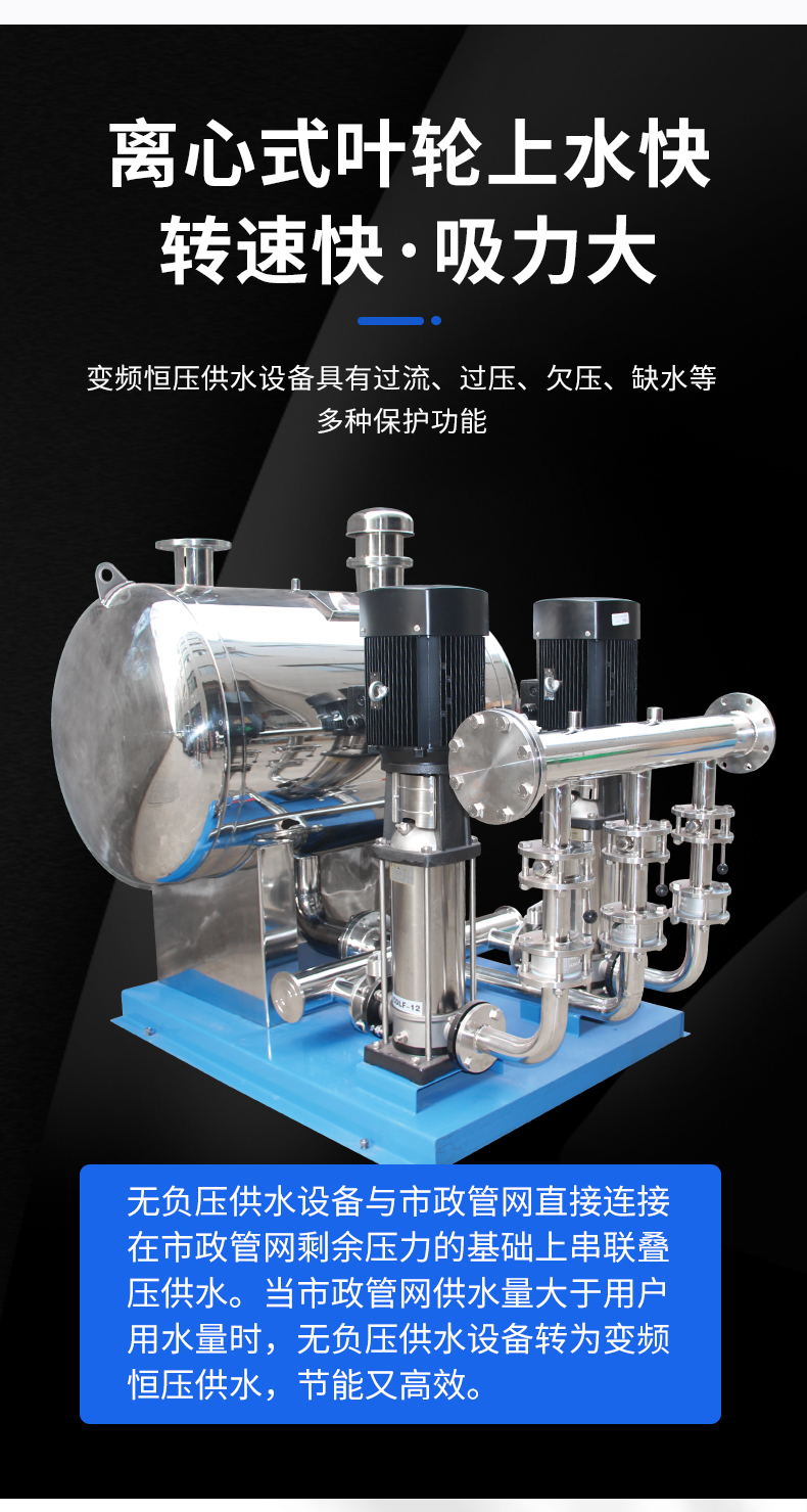 保護(hù)功能全:主機(jī)采用的進(jìn)口變頻調(diào)速器自身具備多種強(qiáng)大的保護(hù)功能,如欠壓、過壓、過流、過載、短路、過熱、失速防止等,其無故障運(yùn)用時間可達(dá) 10 萬小時以上。此外,設(shè)備的配電控制部分采用智能化控制原理,操作方便實(shí)用,設(shè)備工作狀況一目了然,便于非專業(yè)人員快速熟悉和掌握。即使在設(shè)備出現(xiàn)局部故障時,也能啟用應(yīng)急功能繼續(xù)供水,保障用戶的基本用水需求,大大提高了供水系統(tǒng)的可靠性和穩(wěn)定性。