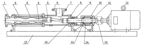 G型單螺桿泵是按迥轉嚙合容積式原理工作的新型泵種。主要工作部件是偏心螺桿(轉子)和固定的襯套(定子)。由于該部件的特殊幾何開頭分別形成單獨的密封容腔。介質由軸向均勻推行流動。內部流速代低,容積保持 不變。壓力穩定,因而不會產品渦流和攪動。 單螺桿泵被廣泛用于各行業輸送各類介質,恒壓連續運行,無脈動,介質輸送無破損,通過調節轉速改變流量從而達到計量的目的。本產品適合輸送具有以下特性的介質:固體含量高(最大粒徑可達150mm)或無固體含量|各種粘度(1mPas-3百萬mPas)的介質.觸變性和易膨脹性介質.剪切敏感性介質.磨蝕性介質.有/無自潤滑性的介質|腐蝕性介質(pH=O-14).粘結性介質.有毒性介質.流量大、壓力高.流量范圍從每小時幾毫升到500m3(2200gpm).壓力范圍最高可達48bar,特殊設計可達72bar。同一種傳動部件可與四種不同設計的轉子/定子匹配,為您提供使用方案。 針對不同的應用領域,選用不同的金屬材料,從鑄鐵、鎳鉻鋼到耐酸材料、哈氏合金及鈦合金。彈性材料可選用耐磨的、耐油的、耐酸的、耐堿的橡膠,如天然橡膠、丁晴橡膠、乙丙橡膠及氟橡膠等。對磨蝕性強的介質,可選用陶瓷或塑料。當介質因高溫或含有某些化學成分而不能選用彈性材料時,可選用硬材質定子或剛性定子。各種軸封形式:按客戶的要求,機械密封從單端面機封(帶或不帶急冶)、雙端面機封(背靠背式及串聯式機械密封)到盒式密封;也可選用填料密封、水封環及特殊密封。對有毒介質可提供無泄漏磁力傳動。 G型單螺桿泵結構圖:
