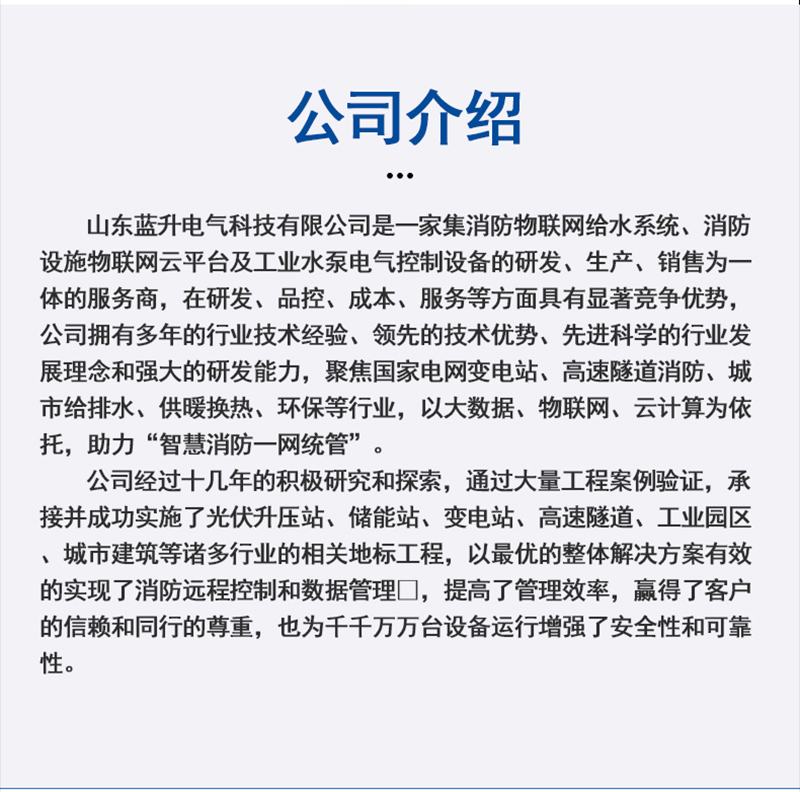物聯網智慧消防遠程集控系統是根據現行國家規范GB50974-2014《消防給水及消火栓系統技術規范》、GB16086-2006《消防聯動控制系統》及相關物聯網標準要求開發出的一種智能化、數字化、集成化的消防給水電氣控制集控產品。該產品包括智慧消防監控信息采集柜、物聯網消防泵控制柜物聯網消防雙電源柜、物聯網消防巡柜、以及消防穩壓柜。物聯網智慧消防遠程集控系統以其獨特的技術優勢,為現代消防安全領域帶來了革命性的變革,這一創新技術的運用,不僅顯著提升了消防給水系統的效率,還為人們的生命財產安全提供了有力保障。